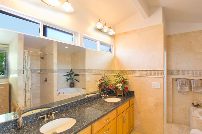 The Third Bedroom has a California King- size bed and overlooks the front lawn with beautiful tropical landscaping and gazebo. It has a private bathroom with shower surrounded by Italian travertine stone. The Fourth Bedroom also has a California king-size bed, and a full bathroom with whirlpool tub and vaulted ceiling is right across the hall.