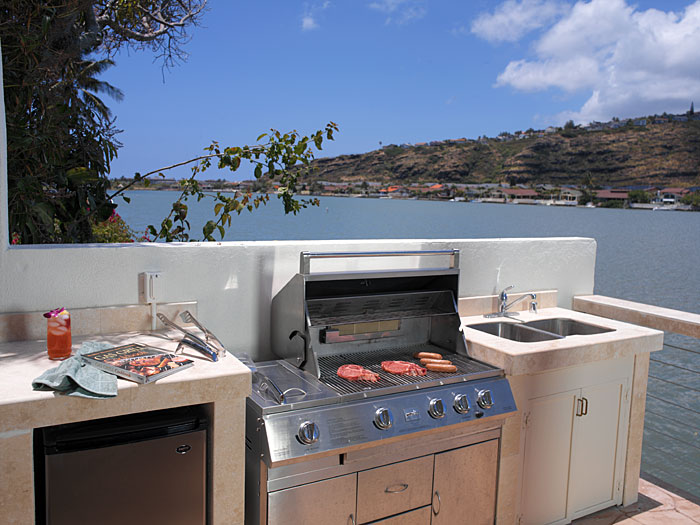 The Pool Deck also has a separate Barbeque Area with gas grill, sink, an adjacent prep table with refrigerator, and a shaded outdoor dining area.
