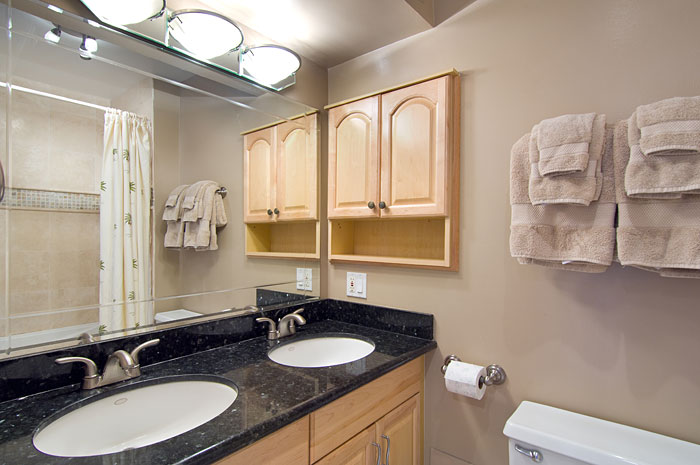 Our Bathrooms include whirlpool tubs, showers, and dual sinks with granite counters, surrounded by Italian travertine stone.