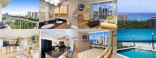 Enjoy spectacular ocean views from these luxuriously-appointed, fully-air-conditioned one-bedroom condominium suites in the heart of Waikiki. Each suite can sleep up to four people with a California king-size bed and a new queen size sofa bed in the living room with an upgraded 6-inch mattress. Each unit includes complete gourmet kitchens, whirlpool tubs and showers, in-unit washers and dryers, premium cable TV with VCR and DVD players, free high-speed wireless Internet access, and assigned, covered parking in the building. Smoking is ONLY permitted outside, on the lanai.